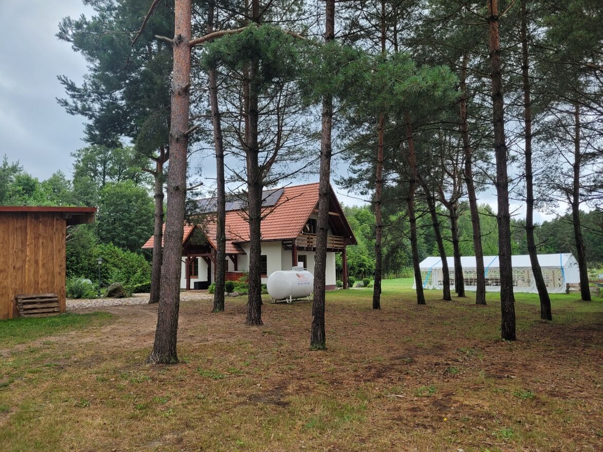 Na działce znajduje się mały plac zabaw, parę hamaków, są 2 miejsca na ognisko, a na stawie znajduje się pomost, z którego można łowić ryby i to bez żadnych ograniczeń i pozwoleń:). Dodatkowo na działce namiot 6m x 12m z ping-pongiem, minibilardem i pilkarzykami. We wrześniu 2025 zakupiona balia na drewno z hydromasażem. Działka jest ogrodzona, a wzdłuż płotu rosną częściowo duże świerki oraz kilka mniejszych świerków, tuj i innych drzewek również owocowych i krzaków zasadzonych w ostatnich latach.