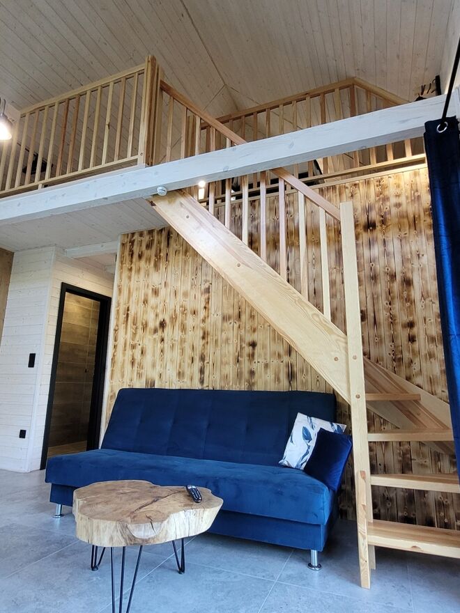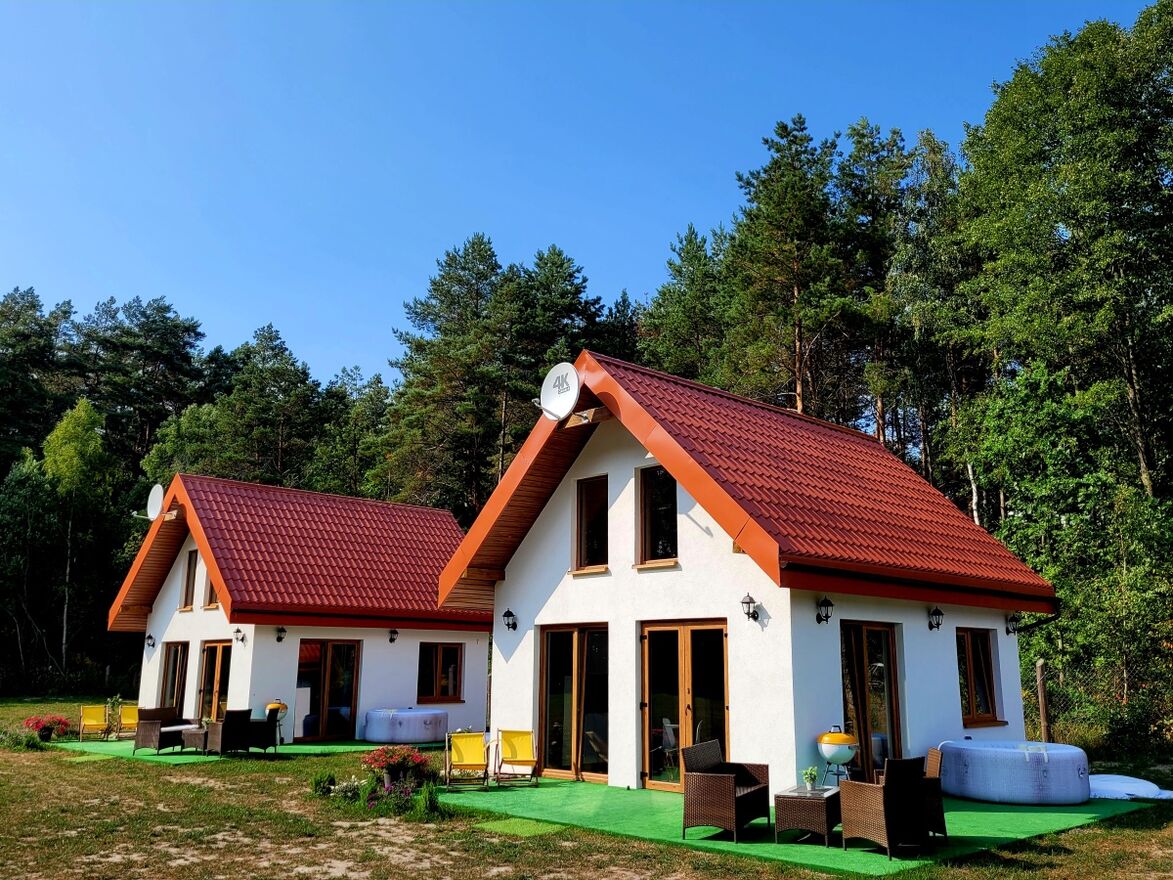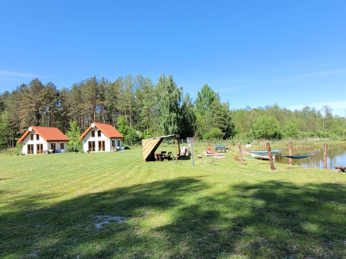 Po jednej stronie stawu znajduje się opisany wyżej dom mieszkalny wraz z garażami, a po drugiej stronie stoją dwa domki caloroczne o powierzchni zabudowy 35m² każdy, obydwa wybudowane w 2023. Powierzchnia po podłodze każdego domku wynosi ok 40m². Są to dwa identyczne domki, murowane i ocieplone z antresolą, wykończone w wysokim standardzie. Kazdy z domków: salon z aneksem kuchennym, łazienka, sypialnia + druga sypialnia na antresoli.
